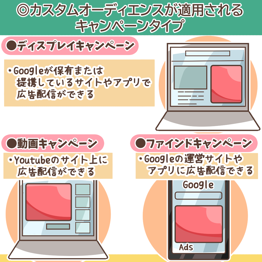 Google広告でカスタムオーディエンスが使えるキャンペーンタイプは次の3つです。