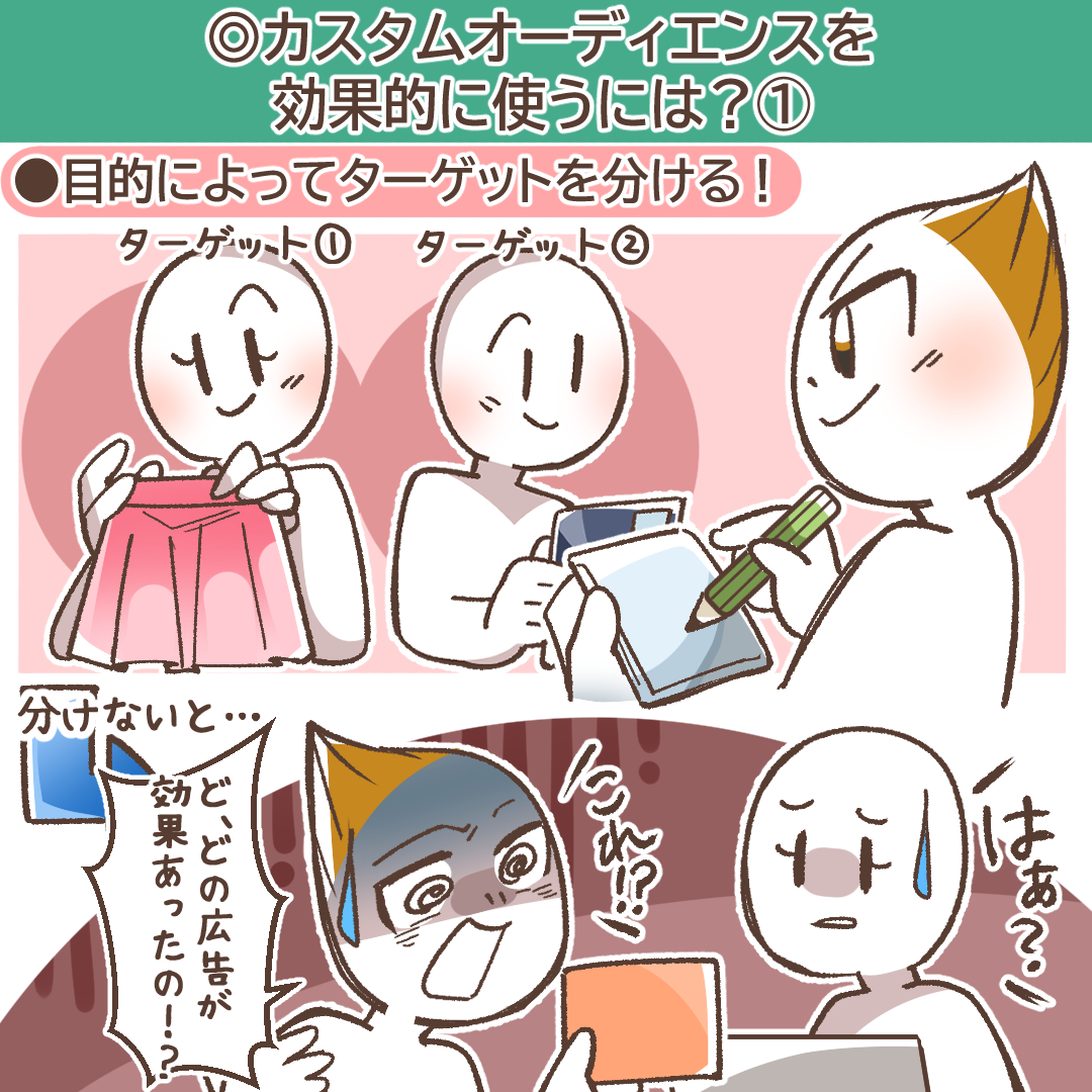 カスタムオーディエンスを効果的に使うには「目的別にターゲットを分けて作成、そしてどのターゲットに成果があったのかわかるようにする」のが大切です。