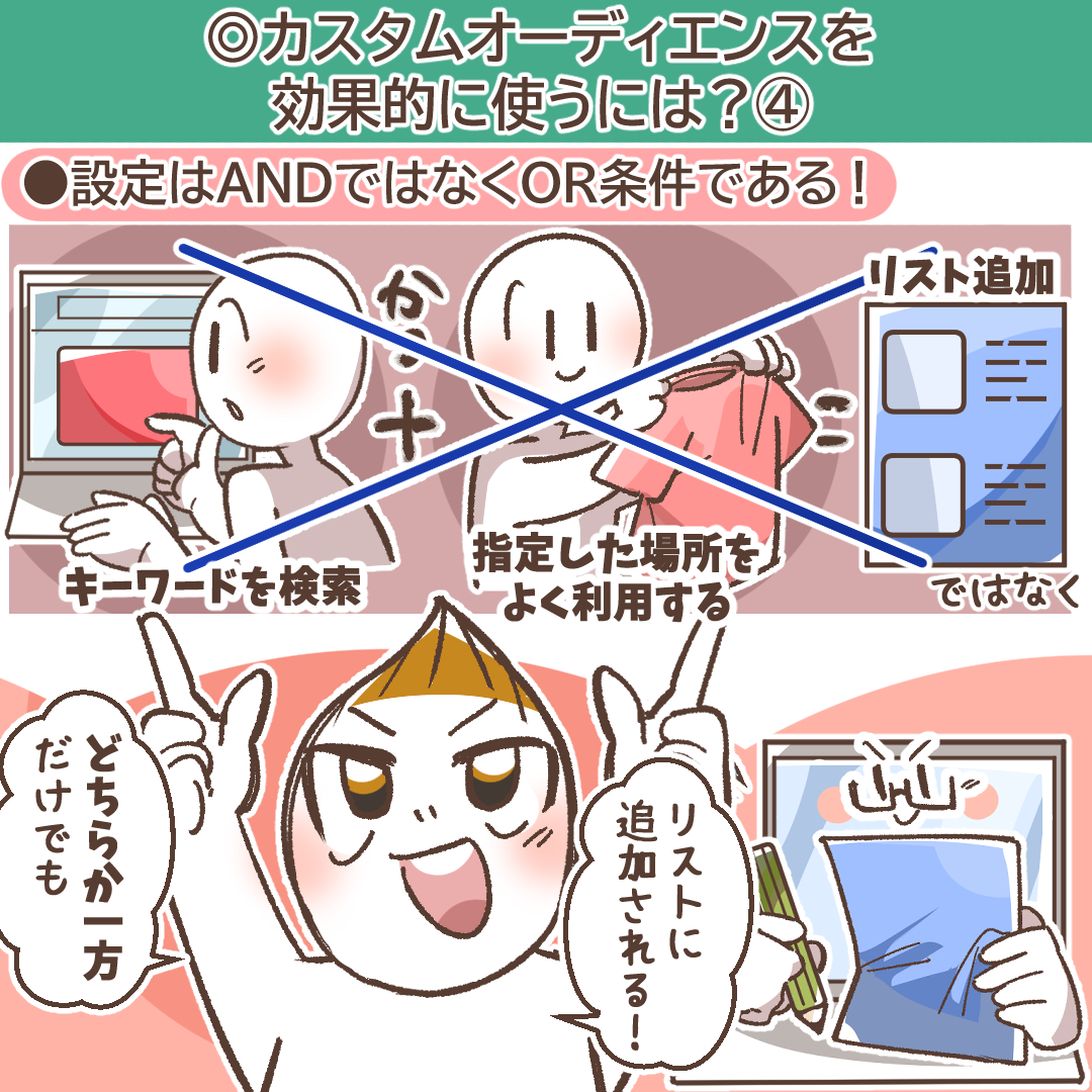 カスタムオーディエンスは「キーワード・URL・アプリ・場所」を設定できますが、「AND条件」ではなく「OR条件」であることを覚えておきましょう。