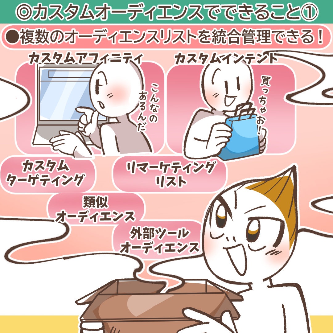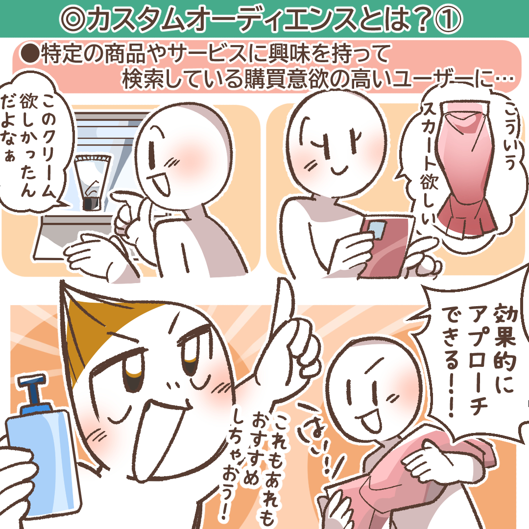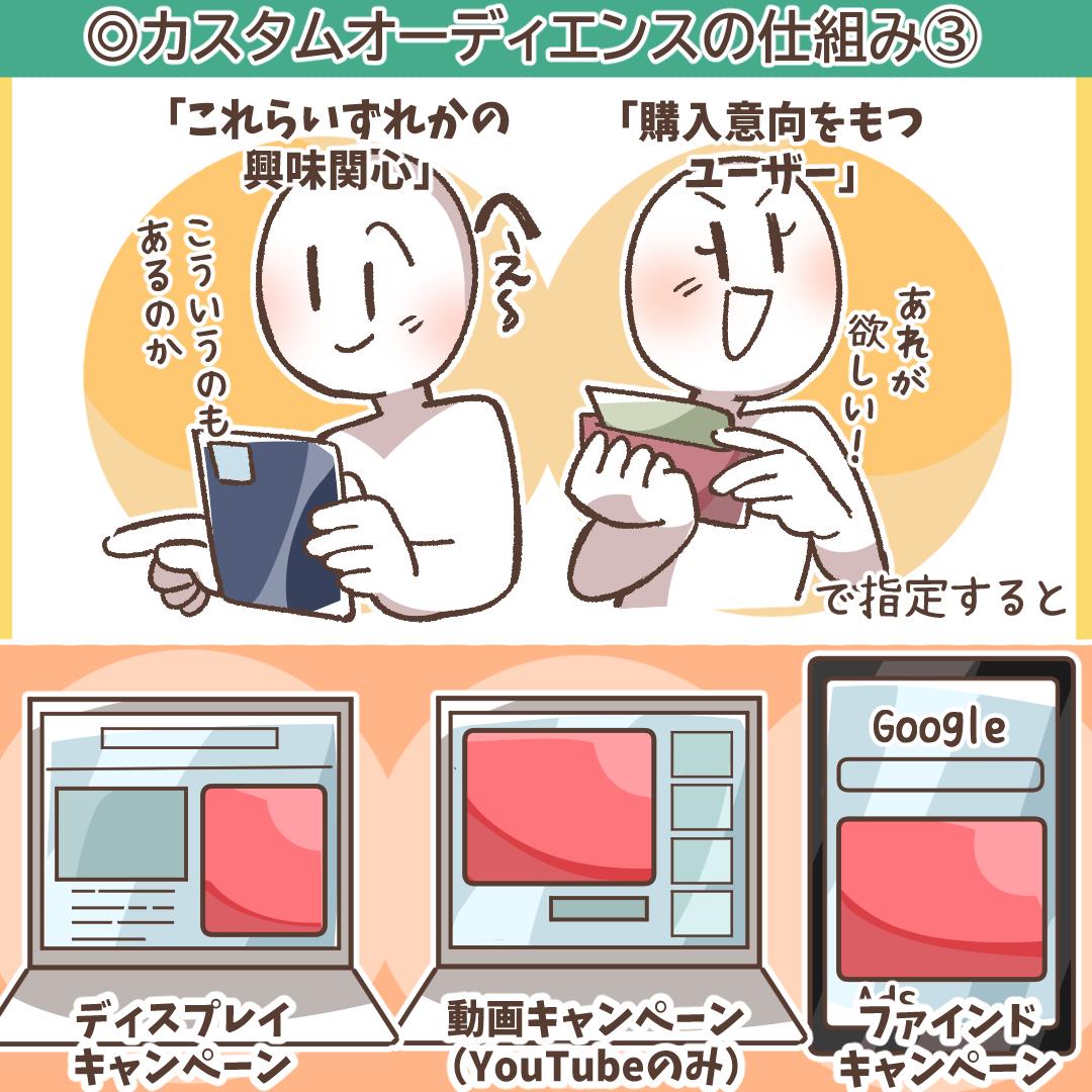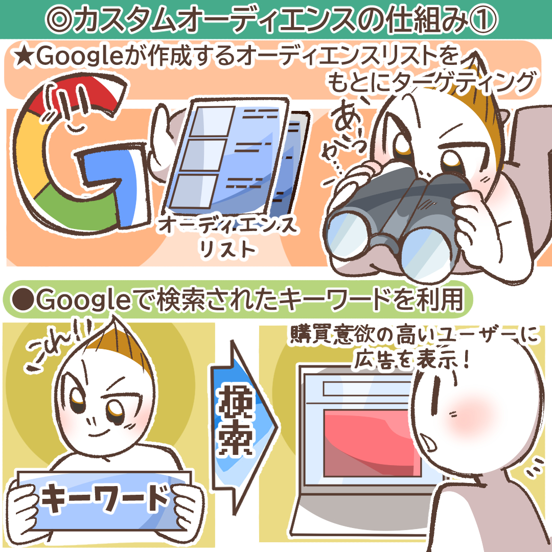 カスタムオーディエンスは、Googleが作成するオーディエンスリストをもとにターゲティングします。オーディエンスリストとは、広告配信をしたい対象者を蓄積したリストのこと。