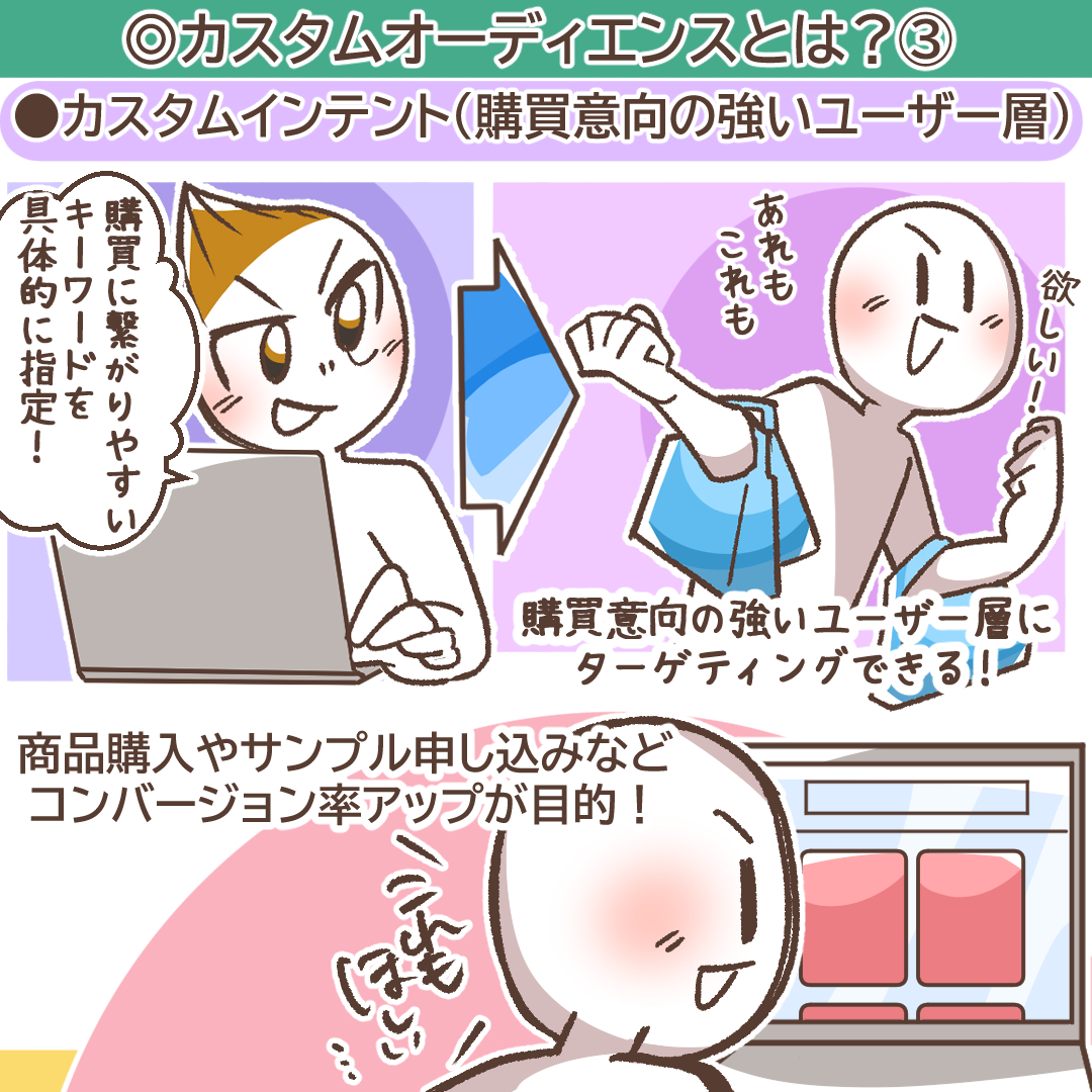 一方でカスタムインテントは、対象の商品に対してすでに購買意向があるユーザー層をターゲットに、商品購入やサンプル申し込みなどコンバージョン率アップが目的になります。
