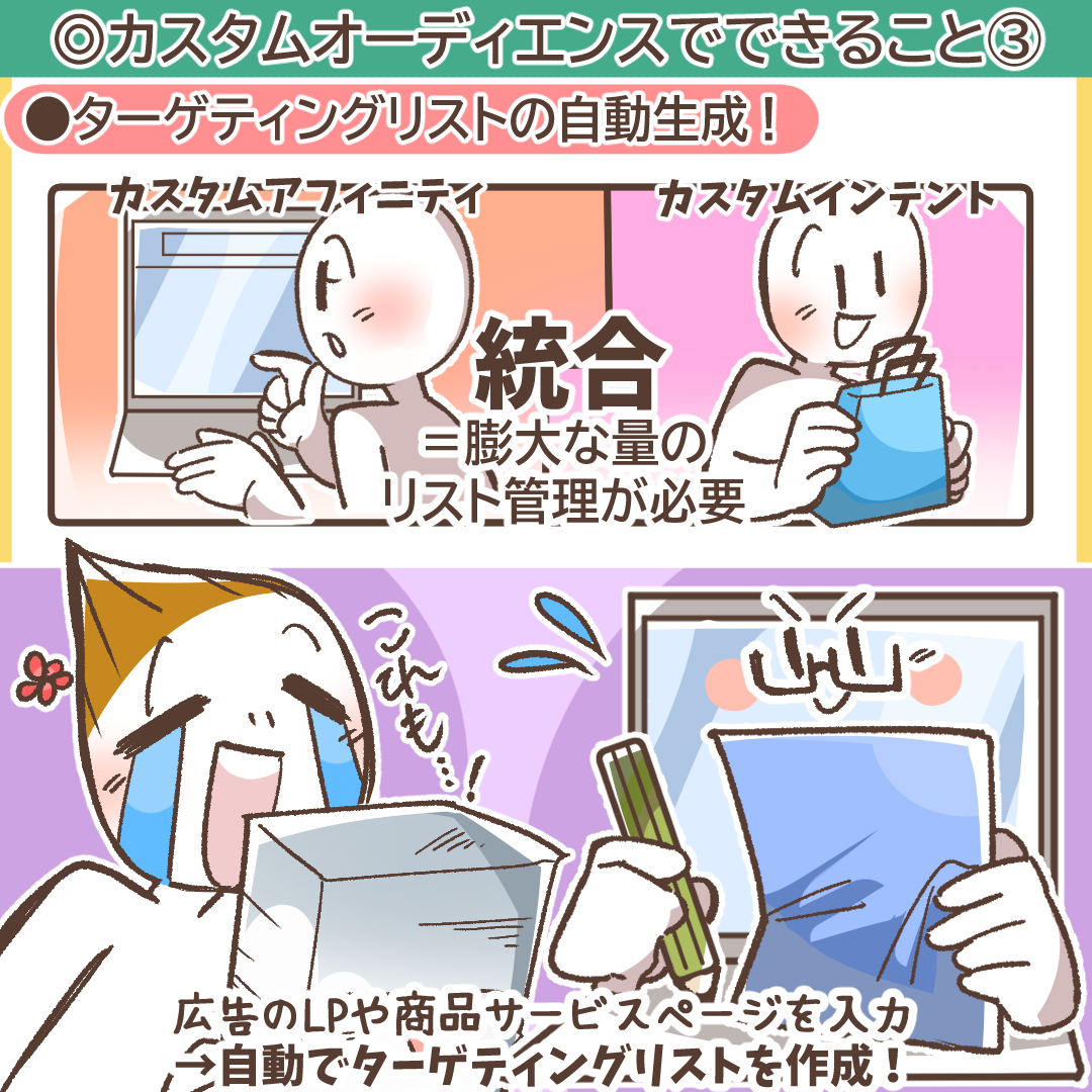 従来の「カスタムアフィニティ」と「カスタムインテント」では膨大な量のターゲティングリストがありました。そして2つが統合されたことで、さらに膨大な量のリスト管理が必要です。