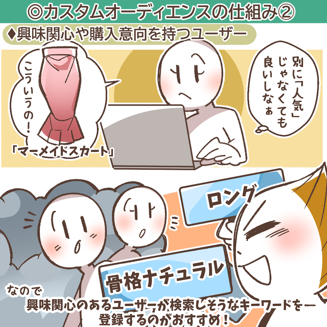 ゆえに見込みのターゲットにより多くリーチしたい場合は、商品やサービスに関心のあるユーザーが検索しそうなキーワードを登録するのがおすすめです。