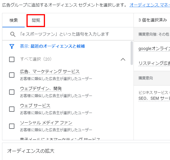 Googleでは機会損失を防ぐためにも「これらいずれかの興味/関心や購入意向を持つユーザー」の選択が推奨されています。