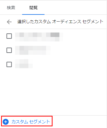 - 「+カスタムセグメント」をクリックして設定画面を表示
