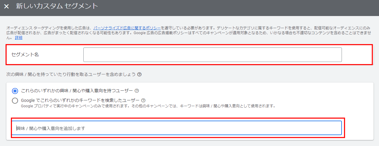 指定したキーワードの基づきかたは「興味・関心や購入意向を持つユーザー」「Googleでいずれかのキーワードを検索したユーザー」の2種類から選べます。