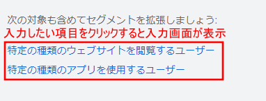 - 「次の対象も含めてセグメントを拡張しましょう」で入力したい項目をクリックして表示・入力