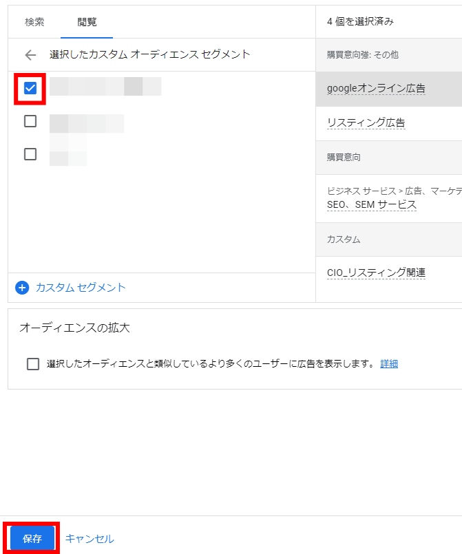 - 5の画面に、作成したカスタムオーディエンスが表示されるので、チェックボックスにチェックをして「保存」をクリックで終了