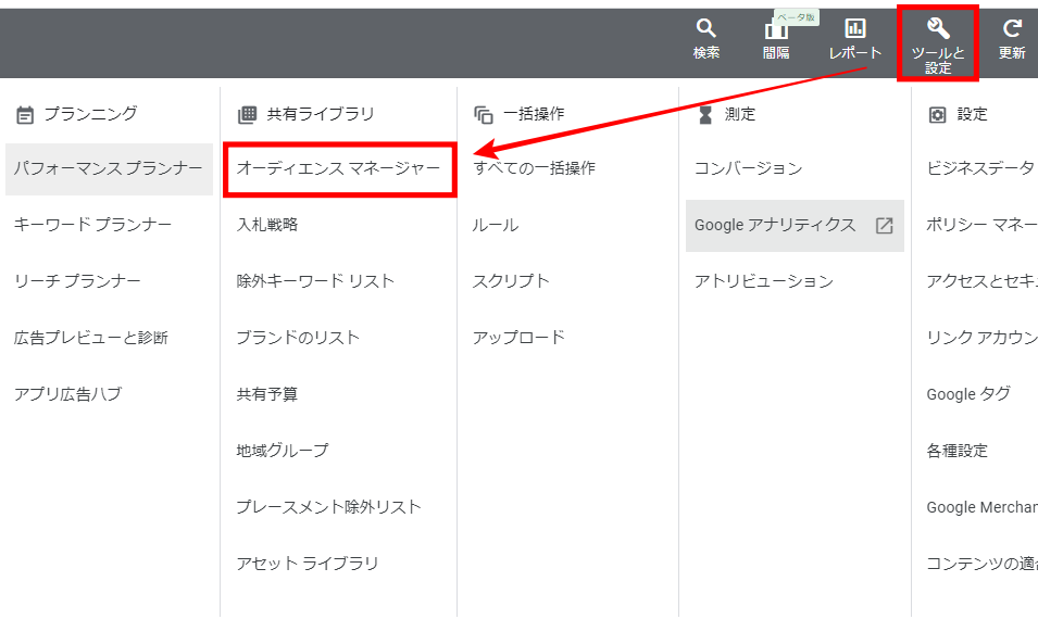 - Google広告の管理画面の右上「ツールと設定>オーディエンスマネージャー」をクリック