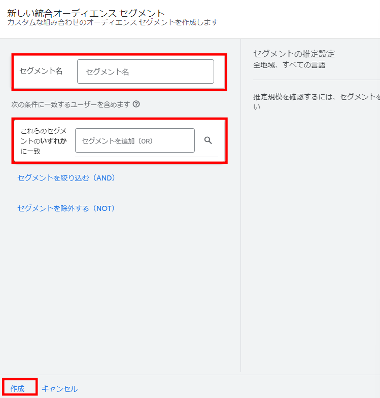 - 作成画面が開くので「セグメント名」「キーワード」「URL」「アプリ」「場所」を入力して「作成」をクリック