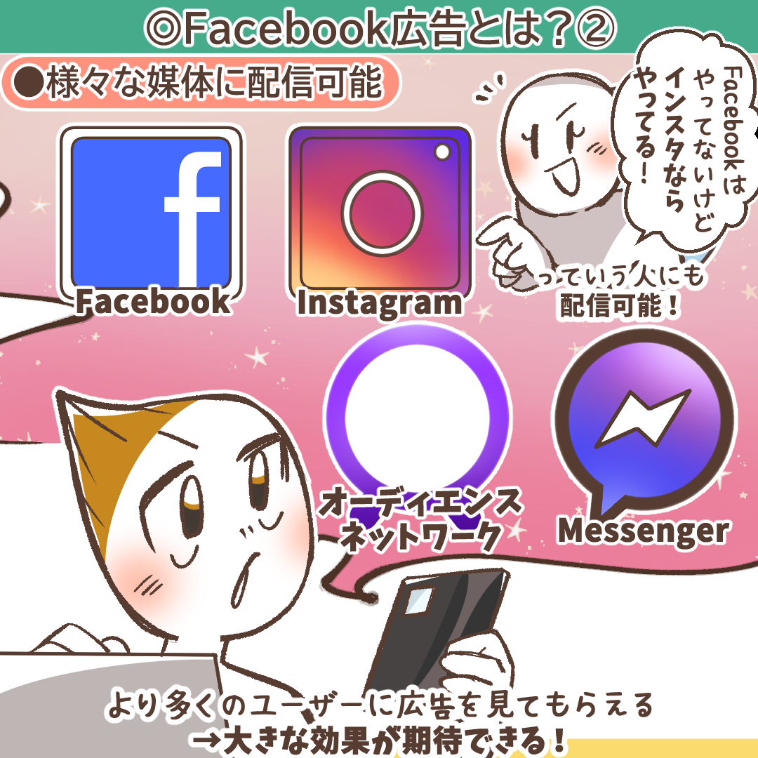 Facebookを運営するMeta社は他にもさまざまなSNSやアプリなどを運営しており、Facebookのユーザー以外にもアプローチが可能です。