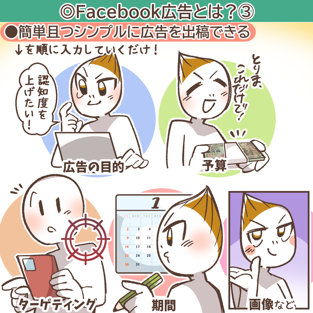 Facebook広告はそんな初心者にも安心です。Facebook広告を出稿する際は、広告の目的、予算、ターゲティング、配信期間、画像などを順に入力します。