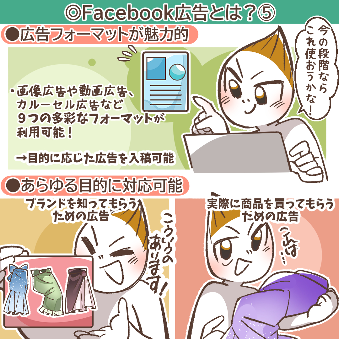 Facebook広告には画像広告や動画広告、カルーセル広告など9つの多彩なフォーマットが利用可能です。