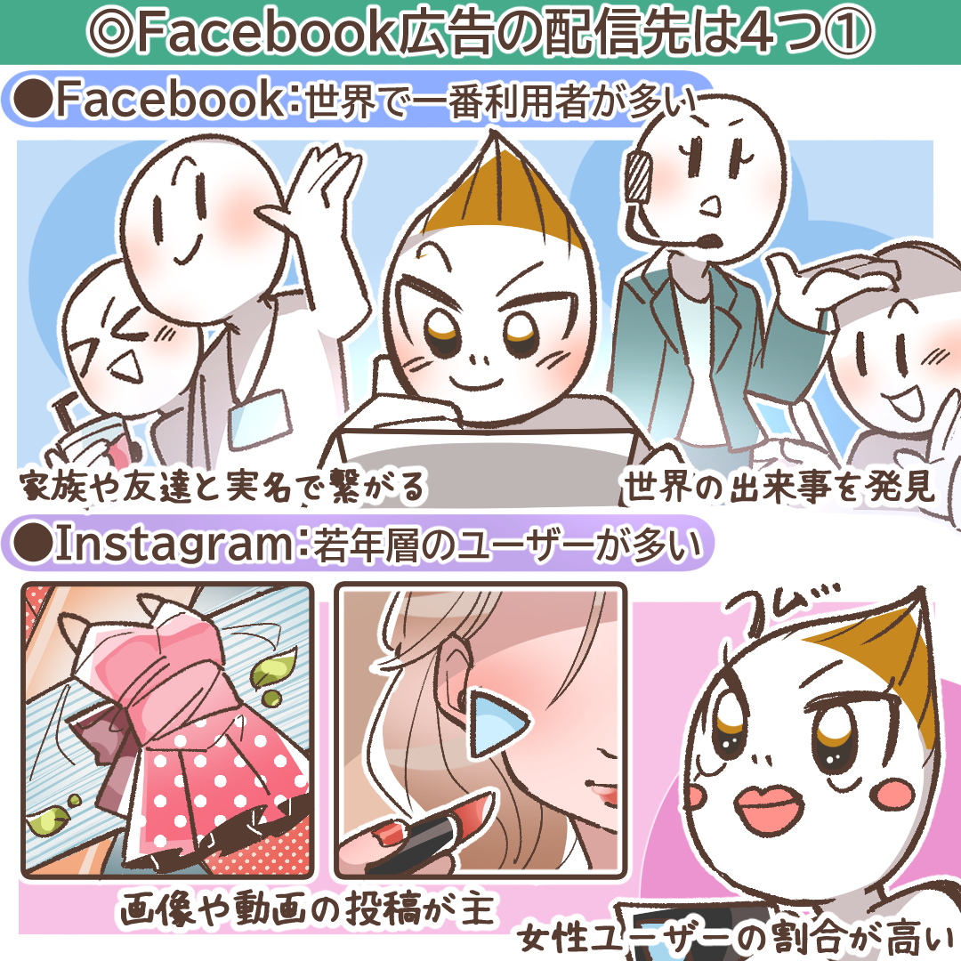 Facebook広告を利用するとFacebookをはじめとしたSNSやアプリなど4つの掲載先に広告を配信できます。それぞれの配信先にどのような特徴があるかをご紹介します。