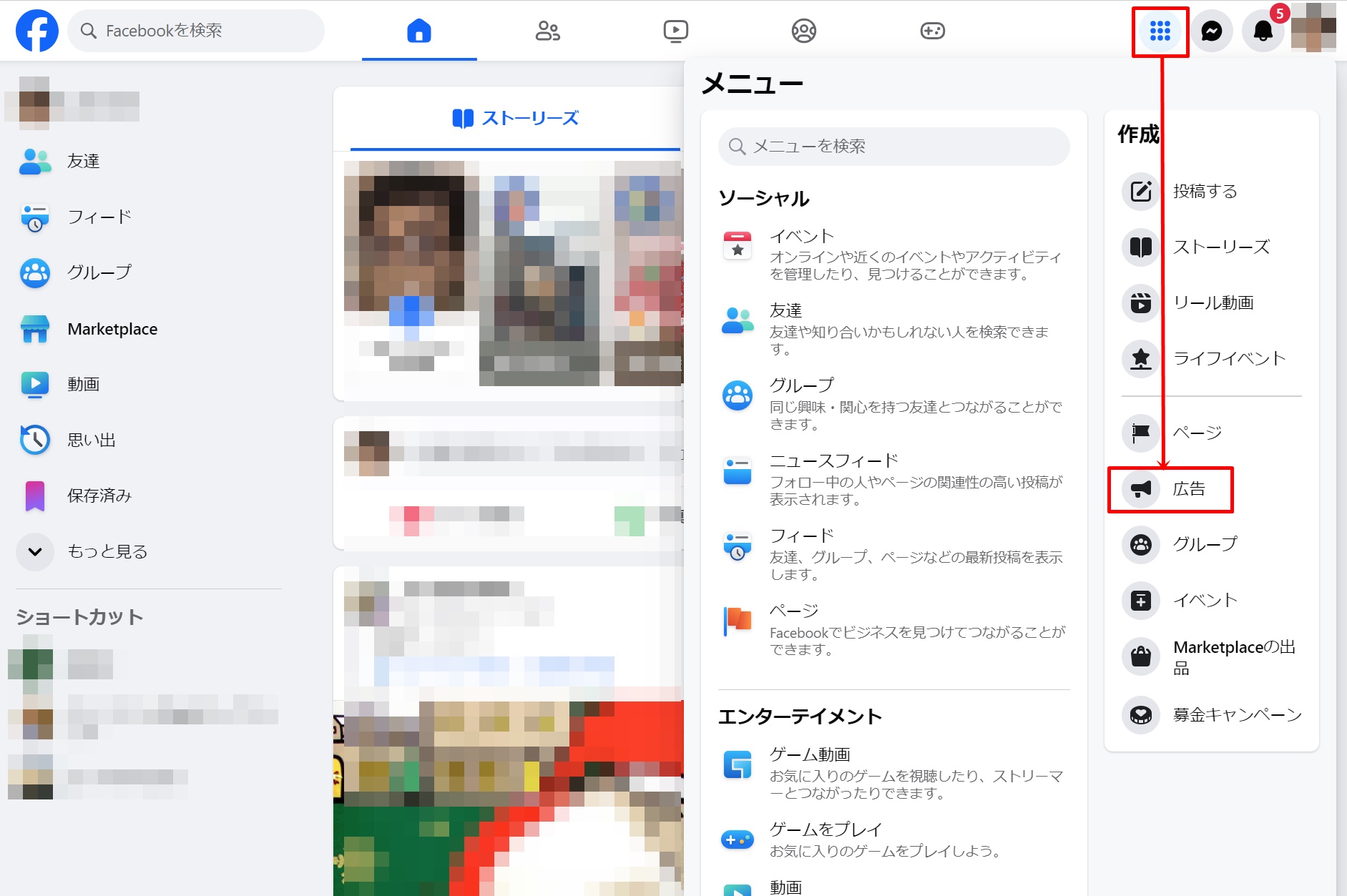 1.Facebookホーム画面左上にある「メニュー」から「広告」をクリック