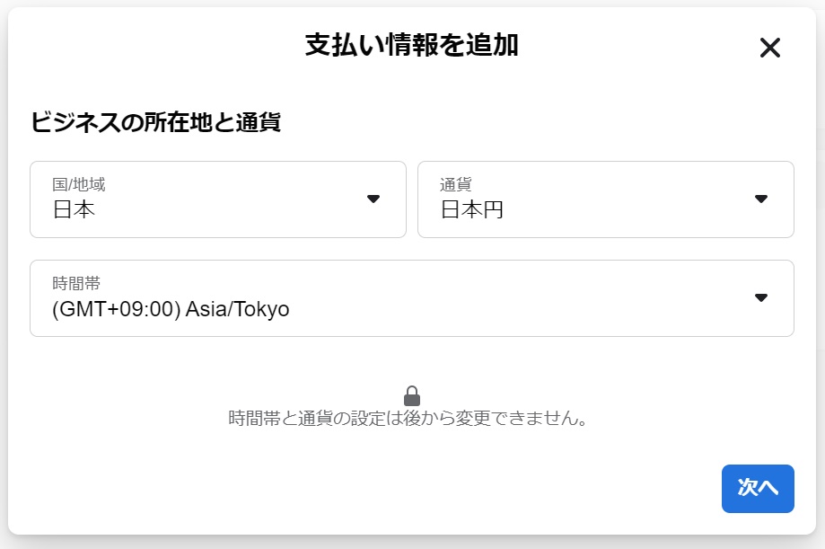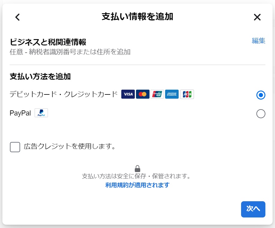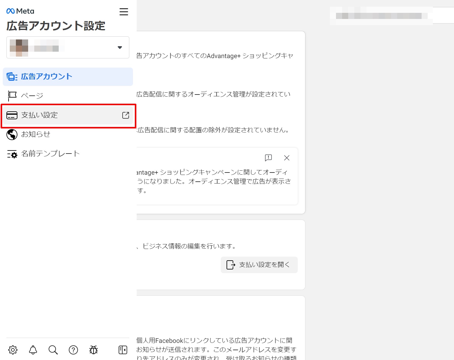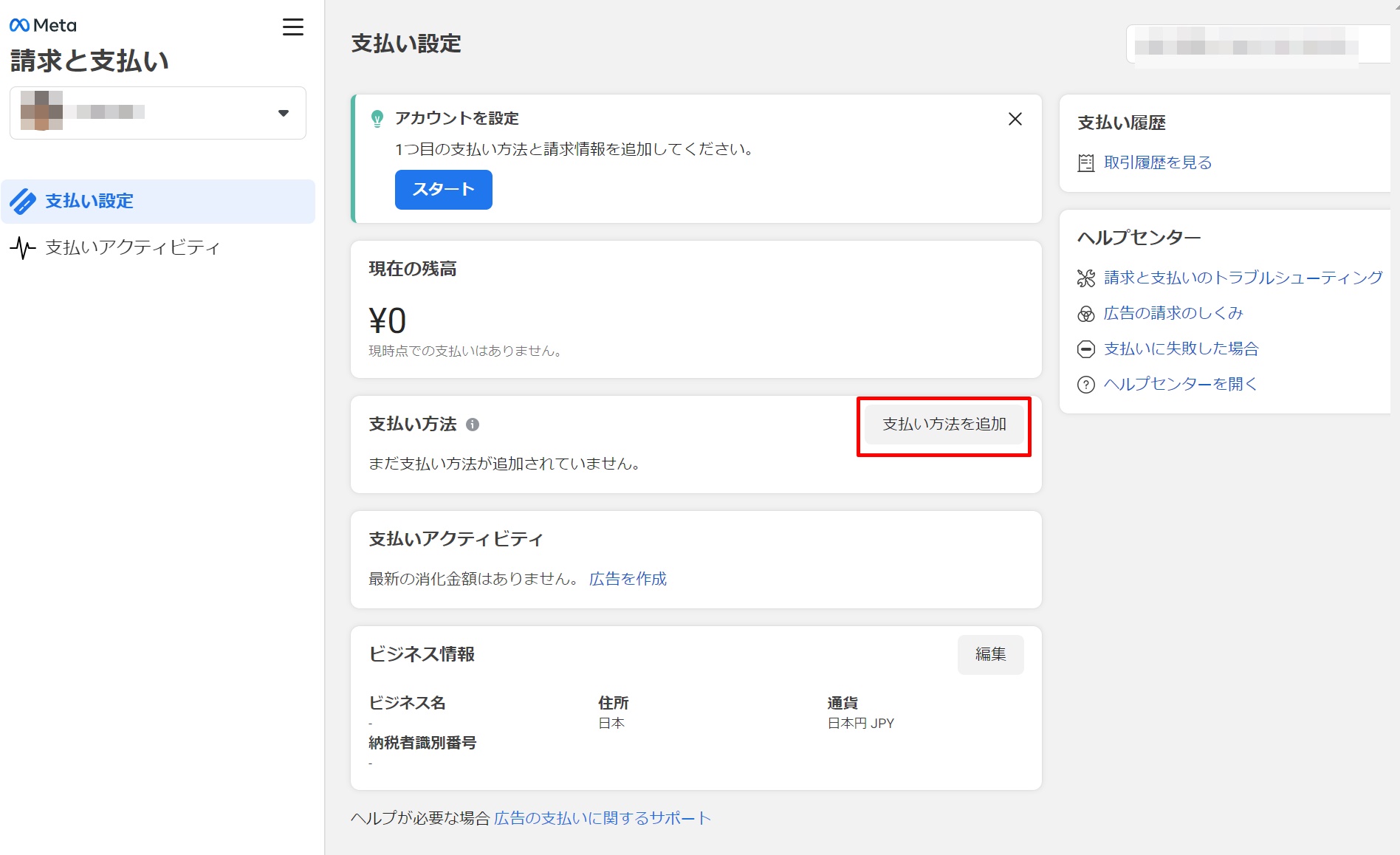 支払い設定ができていないと広告を公開できません。設定画面から支払い方法の設定をしておきましょう。