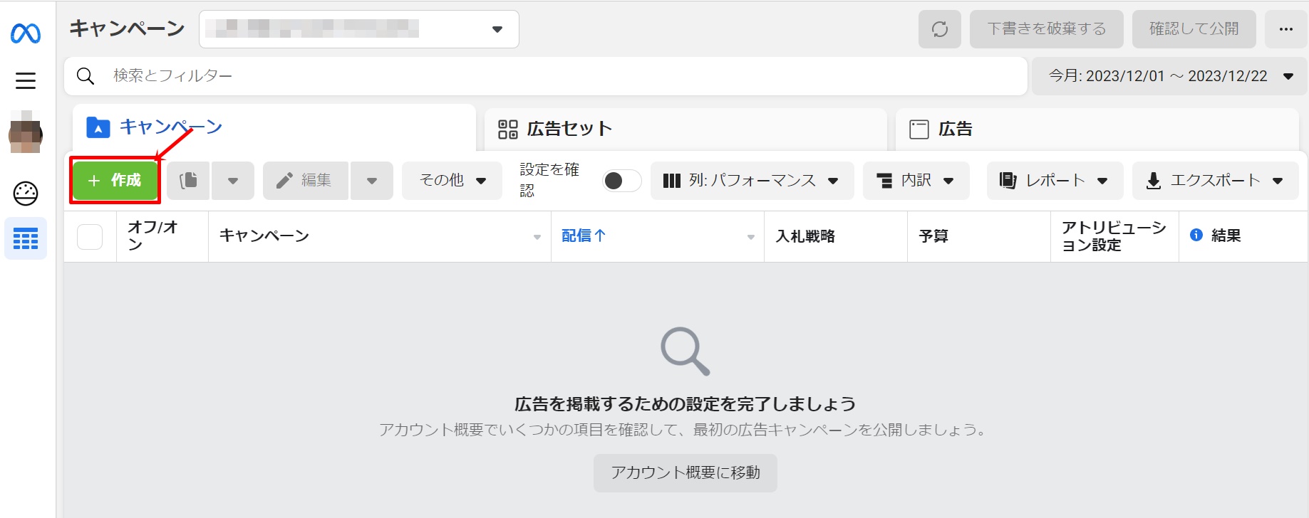 2.表示される広告マネージャ画面で「キャンペーン」タブ内の「広告を作成」ボタンをクリックします。