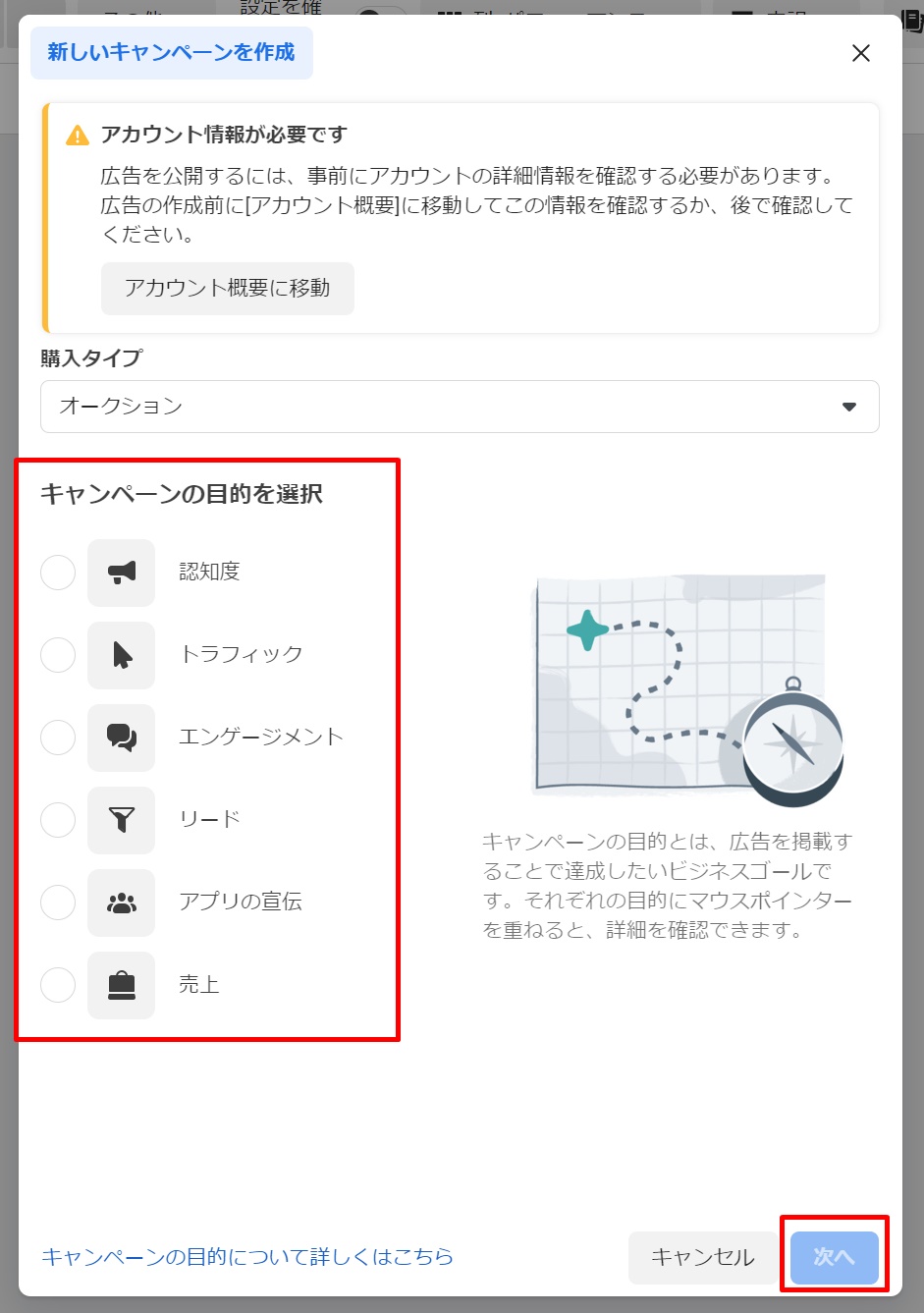 3.新しいキャンペーンを作成する画面が出てくるので、該当する目的を選択しましょう。