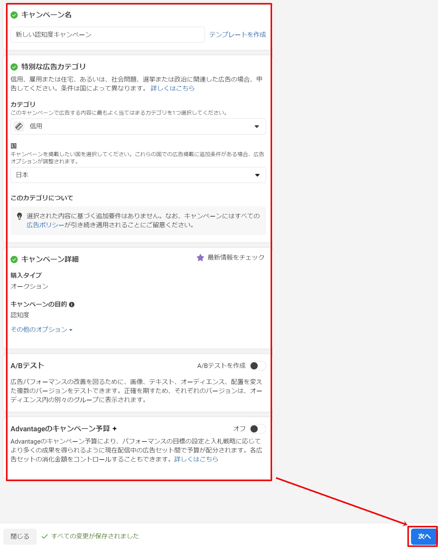 4.キャンペーン名や広告カテゴリなどを入力・選択します。入力が終われば「次へ」をクリック