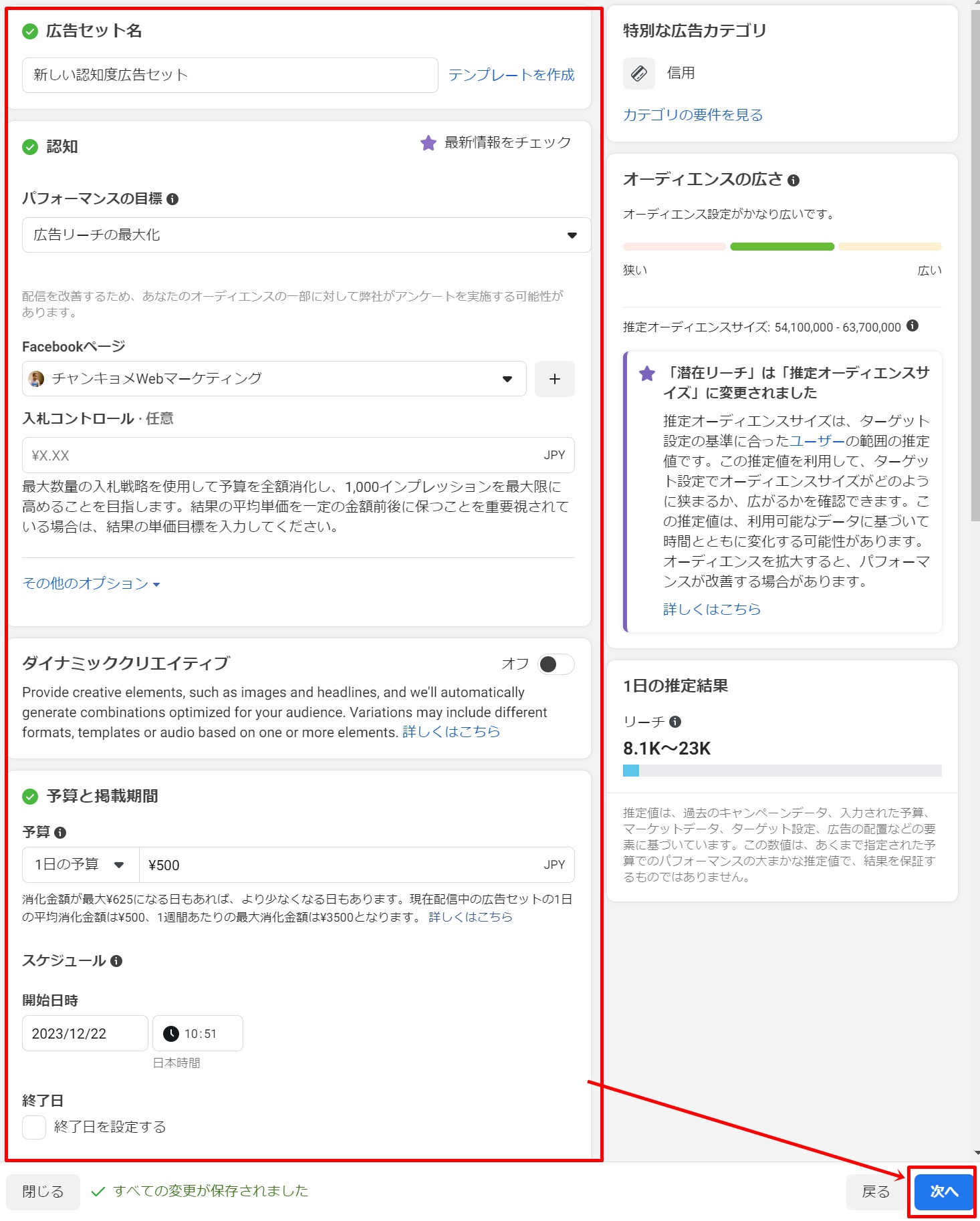 キャンペーンを作成すると、広告セット作成の手順に移行します。