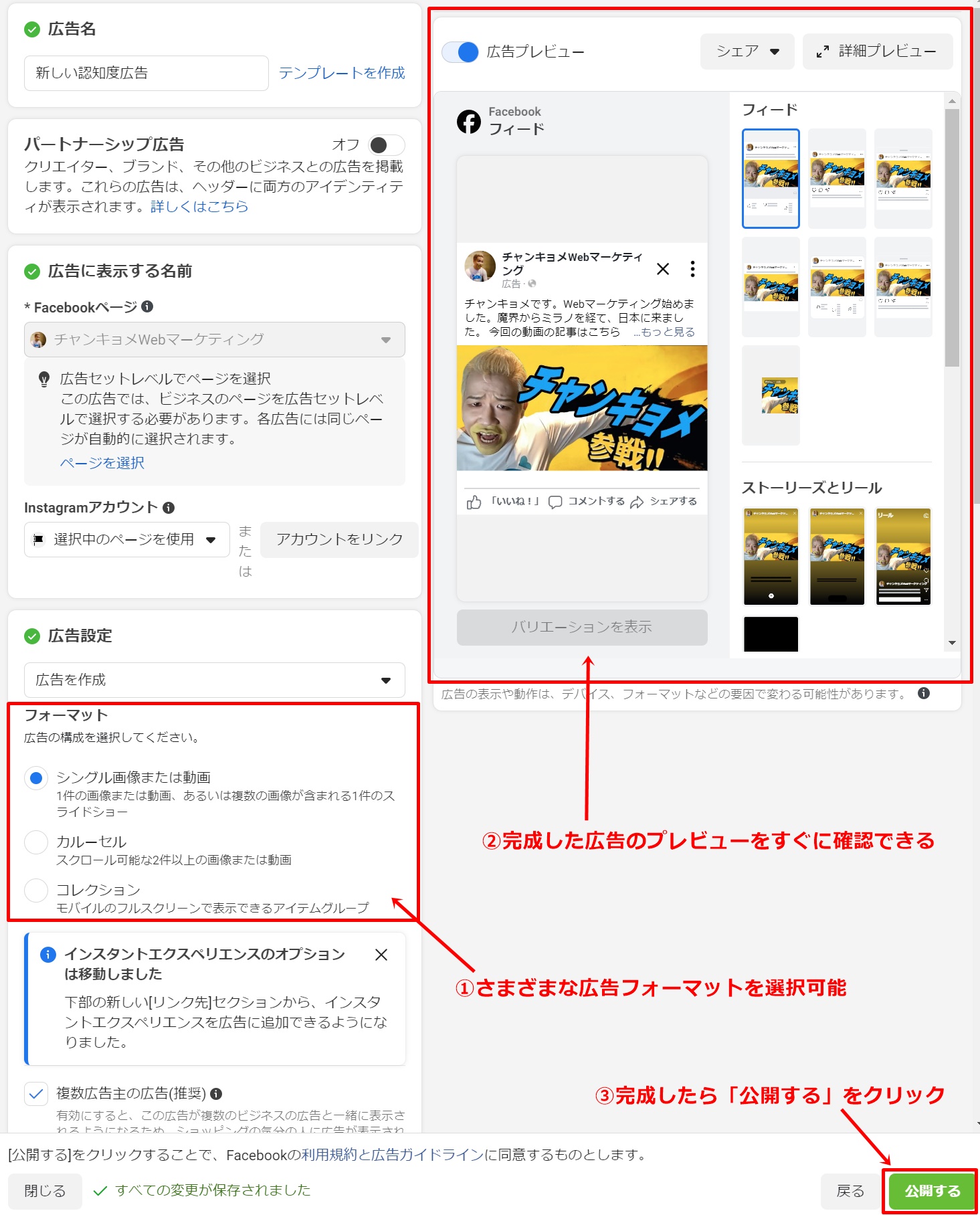 手順が分かりやすく表示され、指示に従うだけで出稿が完了します。多彩なフォーマットが用意されているので、初めての広告出稿でも魅力的な広告が作れます。