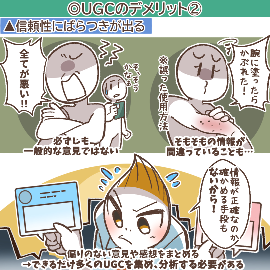 UGCの強みは「リアルな声」であることですが、それは同時に「情報の正確性が保証されていない」というデメリットにも繋がります。UGCはあくまで一般のユーザー個人の主観に基づく感想や意見であり、その内容が客観的な事実と異なる場合や、誤った情報を含んでいる可能性も否定できません。例えば、「このサプリを飲んだら1ヶ月で10kg痩せた」といった投稿は、個人の体験としては事実かもしれませんが、薬機法に抵触する可能性のある表現であり、その効果を万人に保証するものではありません。また、競合他社による意図的なネガティブキャンペーンや、一部のユーザーの極端に偏った意見が、商品全体の評価であるかのように誤解されてしまうリスクもあります。このデメリットへの対策は、「量の確保」と「ファクトチェック」です。できるだけ多くのUGCを収集・分析することで、個別の極端な意見に惑わされることなく、全体的な評価の傾向を客観的に把握することができます。LPや広告にUGCを掲載する際には、できるだけ複数の異なる意見をバランス良く見せることで、情報の偏りをなくし、ユーザーが総合的に判断できる材料を提供することが重要です。また、明らかに事実と異なる情報や、法令に抵触する可能性のある表現を含むUGCは、活用を避けるという厳格な基準を持つ必要があります。UGCの信頼性を担保するのは、それを活用する企業側の責任なのです。