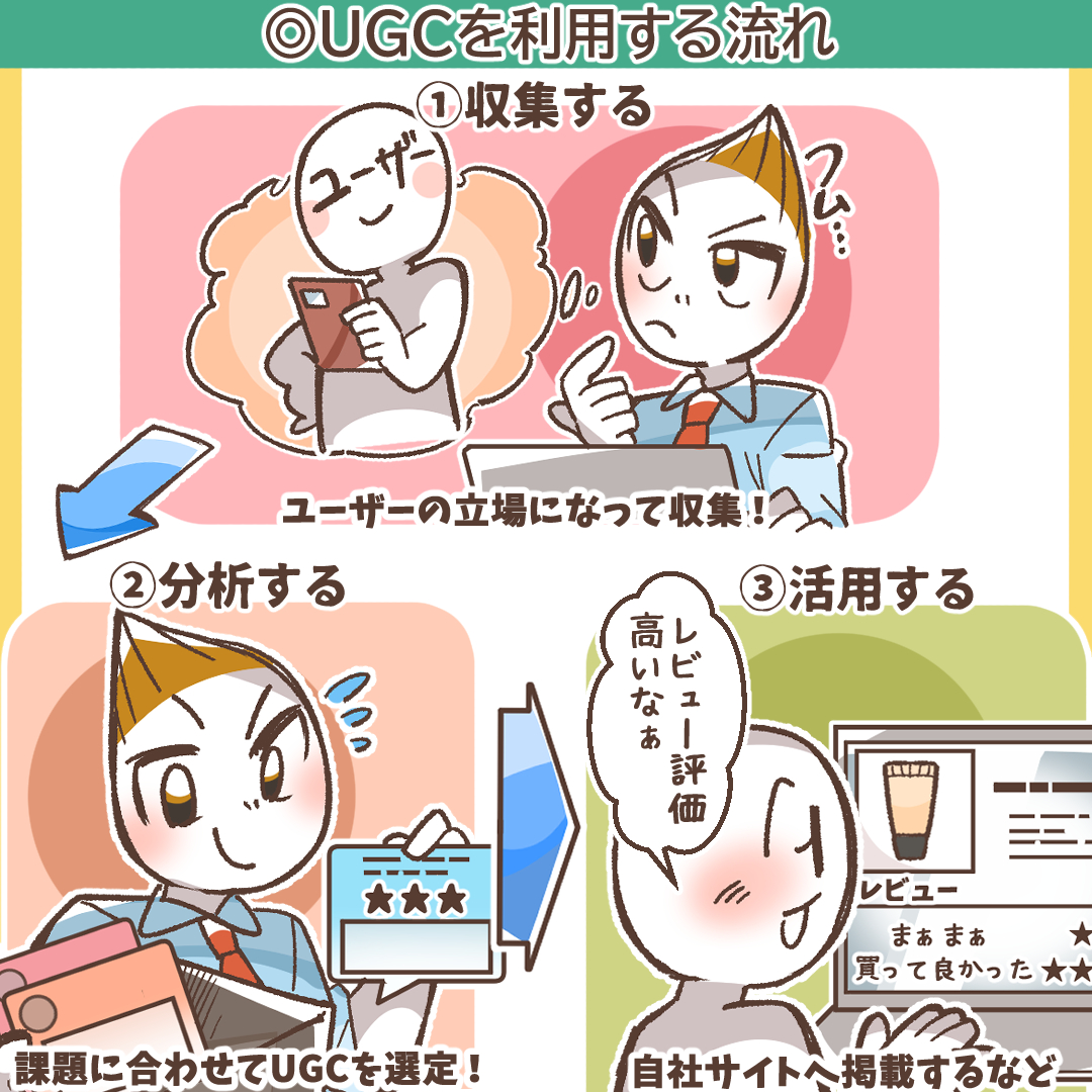 UGCを活用して広告効果を最大化するためには、戦略的なプロセスが必要です。ここでは、UGCをビジネス成果に繋げるための基本的な3つのステップ「収集」「分析」「活用」について、具体的なアクションとともに詳しく解説します。