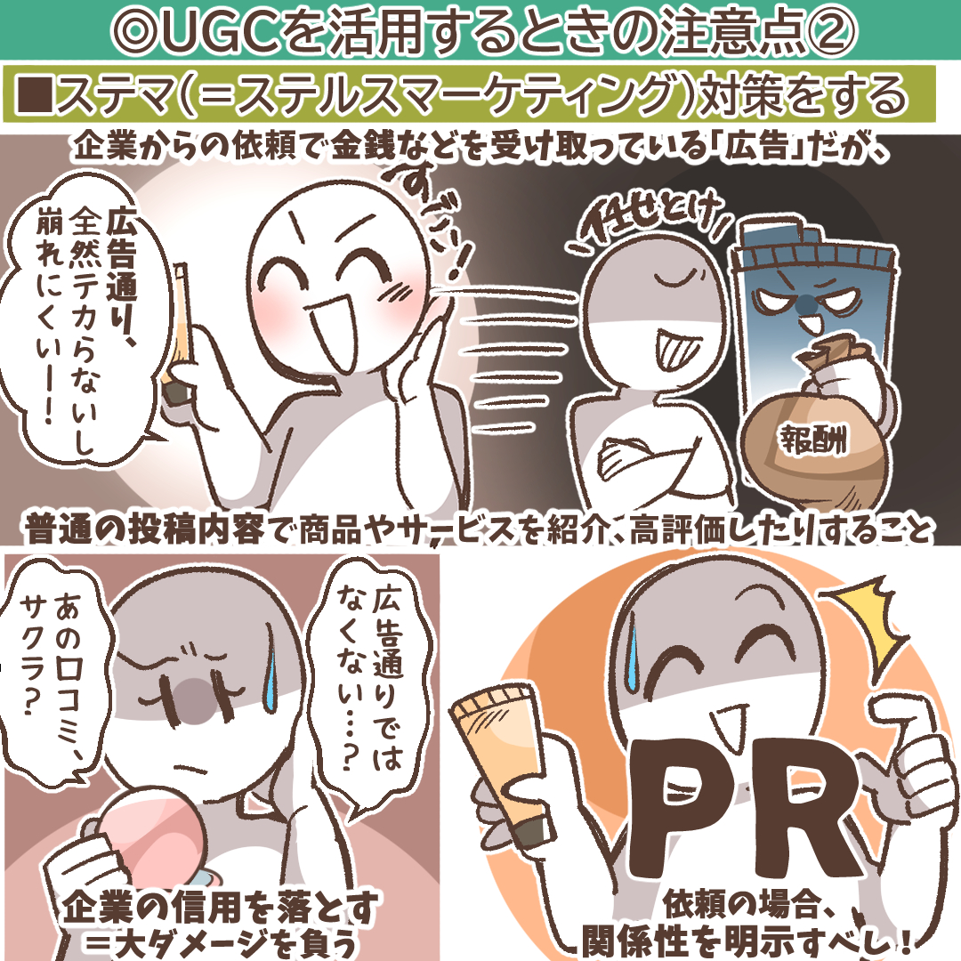 2023年10月1日、景品表示法が改正され、ステルスマーケティング(通称:ステマ)が新たに規制の対象となりました。これは、UGC活用において極めて重要な変更点です。ステマとは、企業が金銭や物品などの対価を提供しているにもかかわらず、その事実を隠して、あたかも第三者の純粋な感想であるかのように見せかけて商品やサービスを宣伝する行為を指します。今回の法改正により、広告主(企業)がインフルエンサーや一般ユーザーに依頼して行わせた投稿で、「広告」であることが一般消費者に分からないものは、景品表示法違反(不当表示)と見なされることになりました。