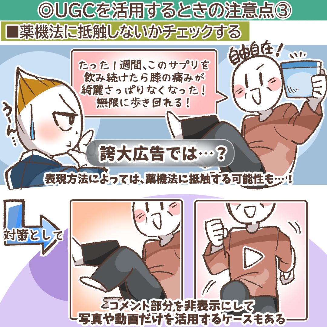 化粧品、健康食品、サプリメント、美容機器、医薬品といった商品を扱う企業にとって、薬機法(医薬品、医療機器等の品質、有効性及び安全性の確保等に関する法律)の遵守は絶対条件です。薬機法では、承認されていない効果効能をうたう広告(誇大広告)が厳しく禁止されています。重要なのは、この広告規制が「企業が作成した広告物だけでなく、企業がマーケティングに活用するUGCにも適用される」という点です。たとえ一般ユーザーの個人の感想であっても、それを企業が自社の広告やLPに掲載した時点で、その内容は企業の広告表現と見なされます。したがって、UGCに薬機法違反の表現が含まれていないか、事前に厳密にチェックする必要があります。
