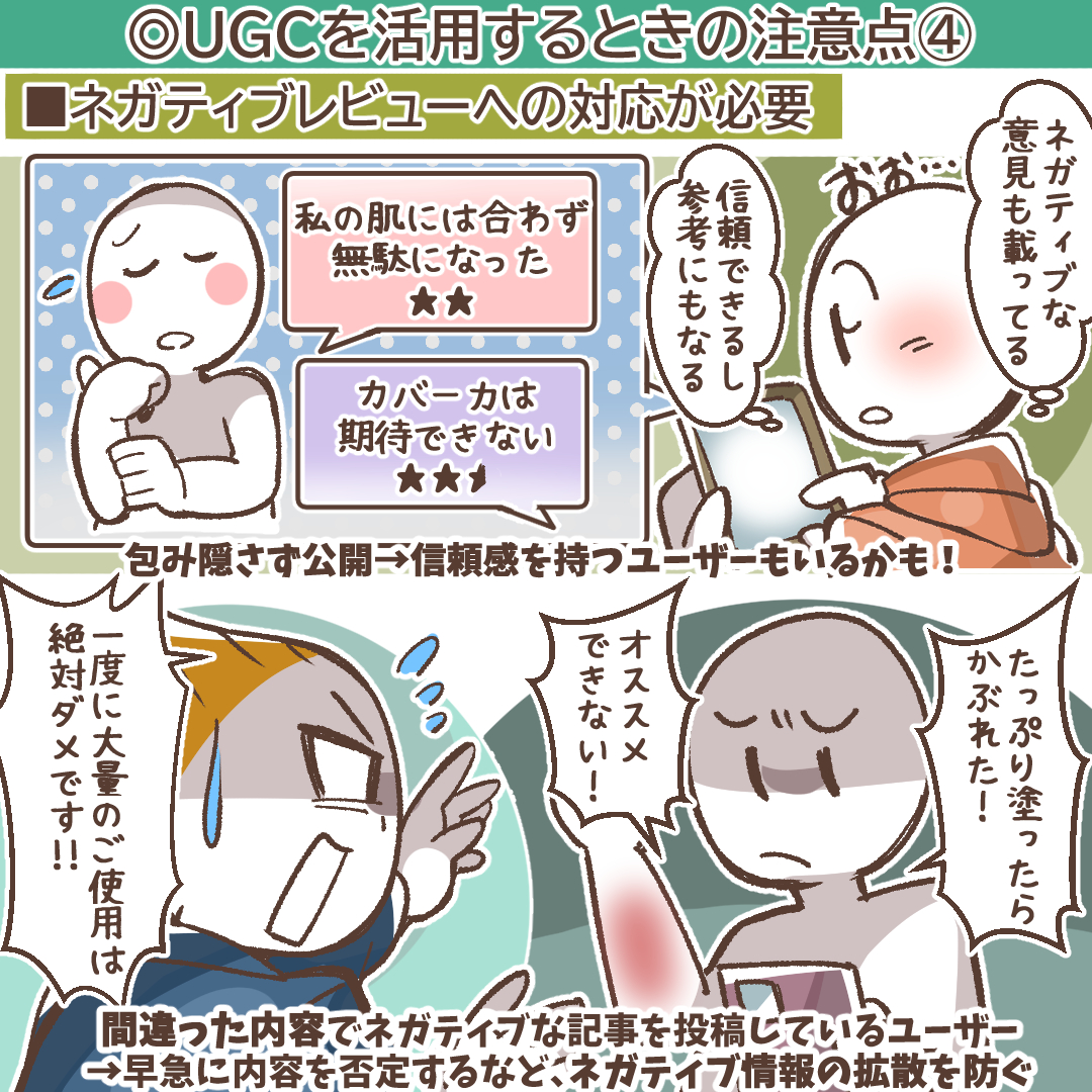 UGCには、ポジティブな内容だけでなく、「期待外れだった」「使いにくかった」といったネガティブなレビューも当然含まれます。これらのネガティブな声をどう扱うかは、企業の誠実さが問われる重要な局面です。ネガティブレビューを無視したり、意図的に隠したりする行為は、長期的には企業の信頼を損ないます。むしろ、これらの声に真摯に向き合うことで、顧客からの信頼を獲得する機会に変えることができます。