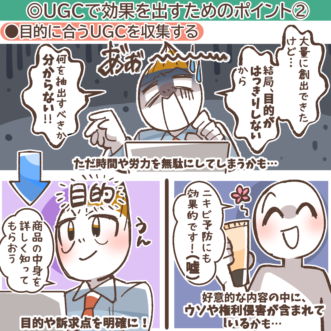 UGC活用の目的を明確化し、その目的に合致したUGCを戦略的に収集・選定することが、施策の費用対効果を高める上で極めて重要です。例えば、広告のクリック率(CTR)を改善したいのであれば、アイキャッチとして優れ、ユーザーの目を引くようなインパクトのある写真や動画UGCが求められます。一方で、ランディングページ(LP)でのコンバージョン率(CVR)を高めたいのであれば、購入を迷っているユーザーの不安を解消し、信頼性を高めるような、具体的な使用感やビフォーアフターが分かる詳細なレビューテキストや、複数のUGCを組み合わせたコンテンツが有効です。目的を明確にすることで、収集すべきUGCの基準(クリエイティブの質、テキストの具体性、投稿者の属性など)が定まり、収集・分析のプロセスが大幅に効率化されます。また、収集したUGCは、必ずその信憑性と安全性を確認する必要があります。特に、以下のような投稿は、企業の信頼を損なうリスクがあるため、採用を避けるべきです。