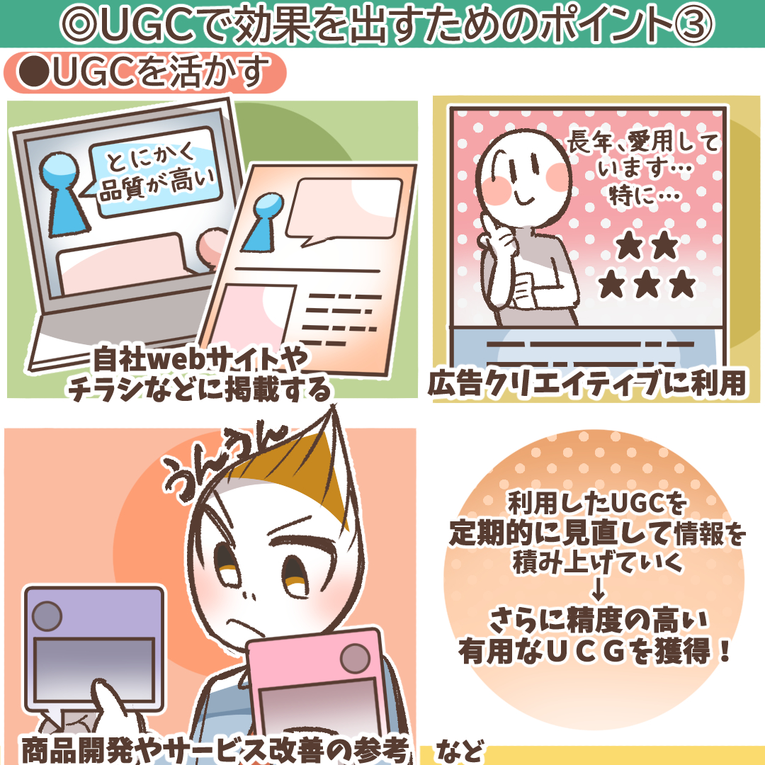 UGCを単に収集・掲載するだけでは、その効果を最大化することはできません。ここでは、UGCを活用して獲得広告のパフォーマンスを継続的に向上させるための、3つの重要なポイントを解説します。