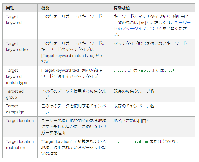 - ターゲット属性:広告を「誰に(どの広告グループやキーワードに)」表示するかを指定するための属性です。