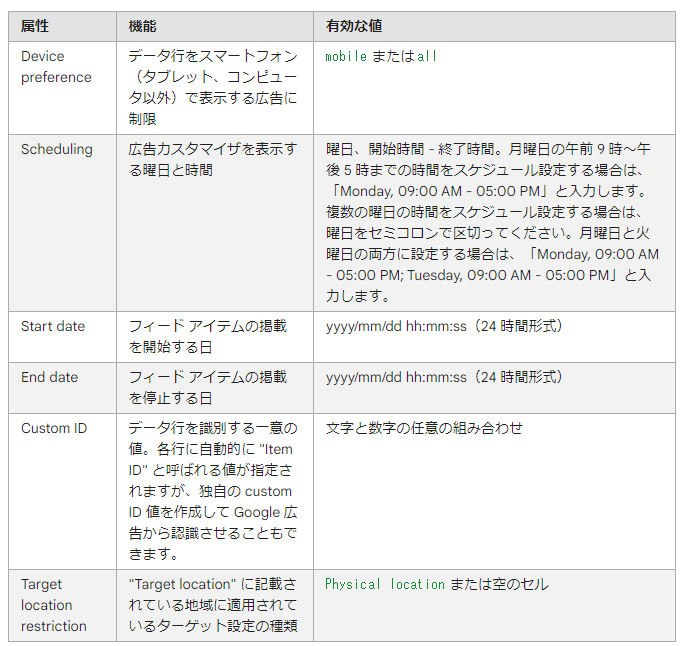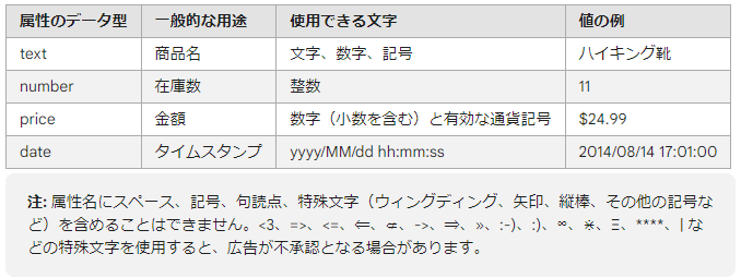 - データフィード内の文法や綴り、ターゲット指定は完全に正確でなければならない