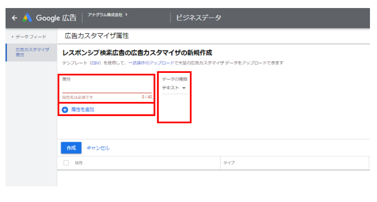 - 左側のメニューから「広告カスタマイザ属性」を選択します。
