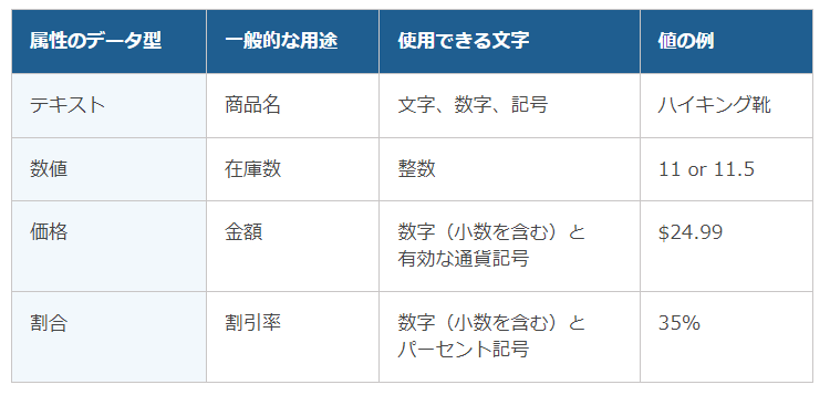フィードを構成する各列(データ)は「属性」と呼ばれ、これには大きく分けて3つの種類があります。