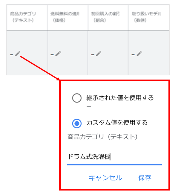 広告管理画面で「広告カスタマイザ属性」を設定した場合も、構文の記述方法は似ています。