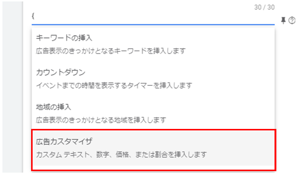 広告見出しや説明文の作成画面で、半角の波括弧「{」を入力するのがスタートの合図です。
