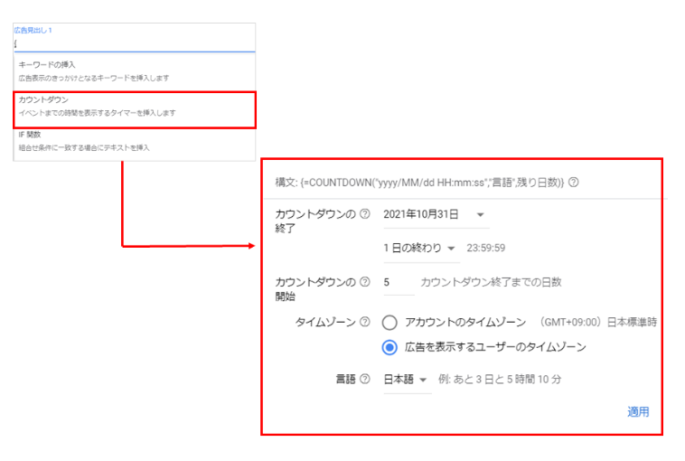 広告作成画面で「{」を入力し、「カウントダウン」を選択すると、上記のような設定画面が表示されます。ここで終了日時を設定すると、広告文にはリアルタイムの残り時間が表示されます。
