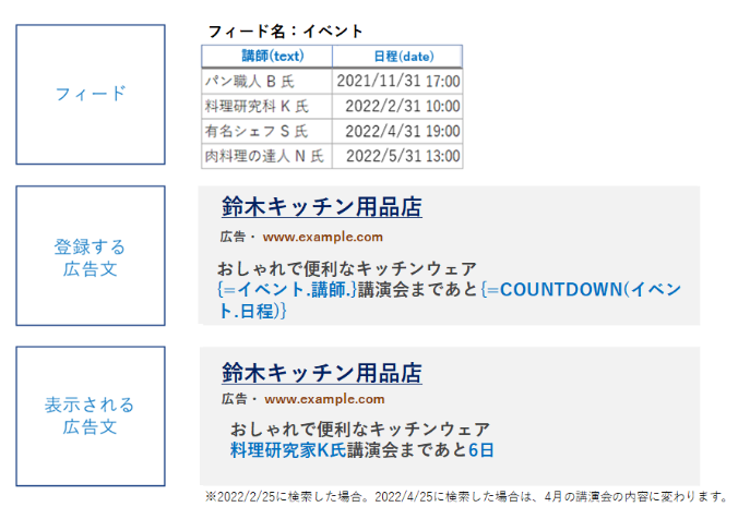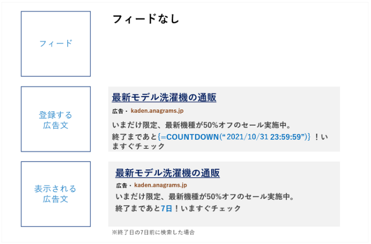 この例のように、データフィードで商品ごとに異なるセール終了日を設定しておき、広告文では {=COUNTDOWN(Products.Sale_end)} のように記述することで、商品ごとに個別のカウントダウンを表示させることができます。