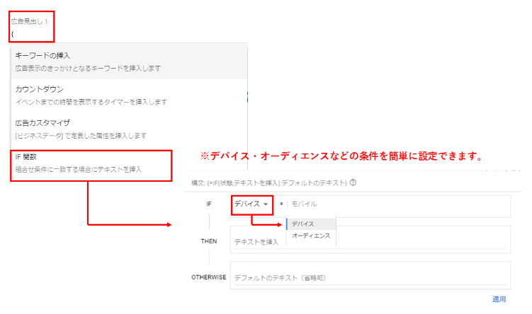 注意:このIF関数は、レスポンシブ検索広告(RSA)ではサポートされていません。 過去の拡張テキスト広告(ETA)で利用されていた機能のため、参考情報として記載します。