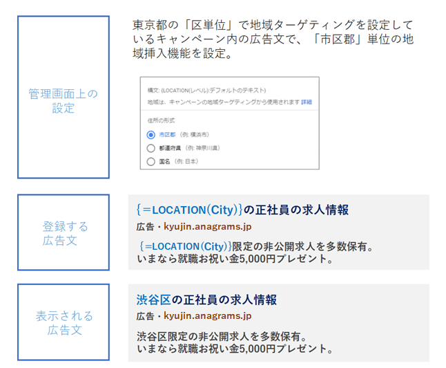 - 挿入される地域名は、キャンペーンの地域ターゲティングで設定している範囲に基づきます。