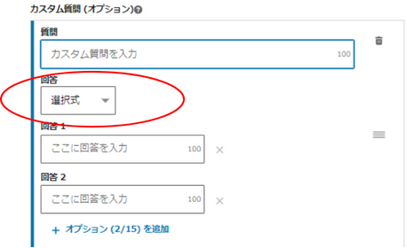 カスタム質問では、質問を追加したい場合は「カテゴリを追加」を、クリックしながら設定します。