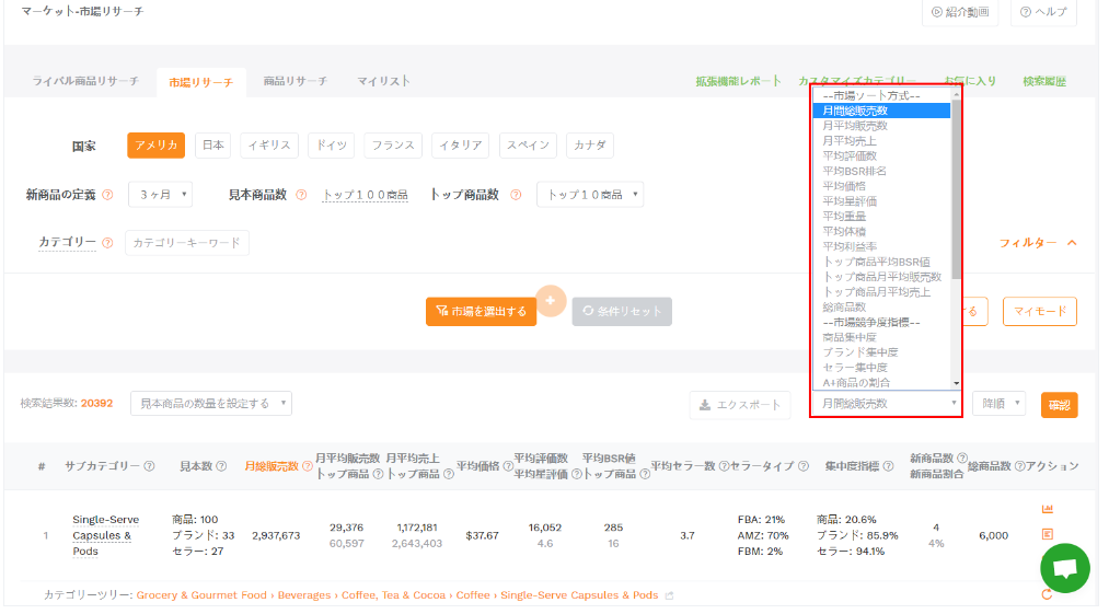 「商品集中度」や「降順」で絞り込みすることで、潜在力のある市場のリサーチもできるので、使い方によってニッチな市場の情報も得られるのです。
