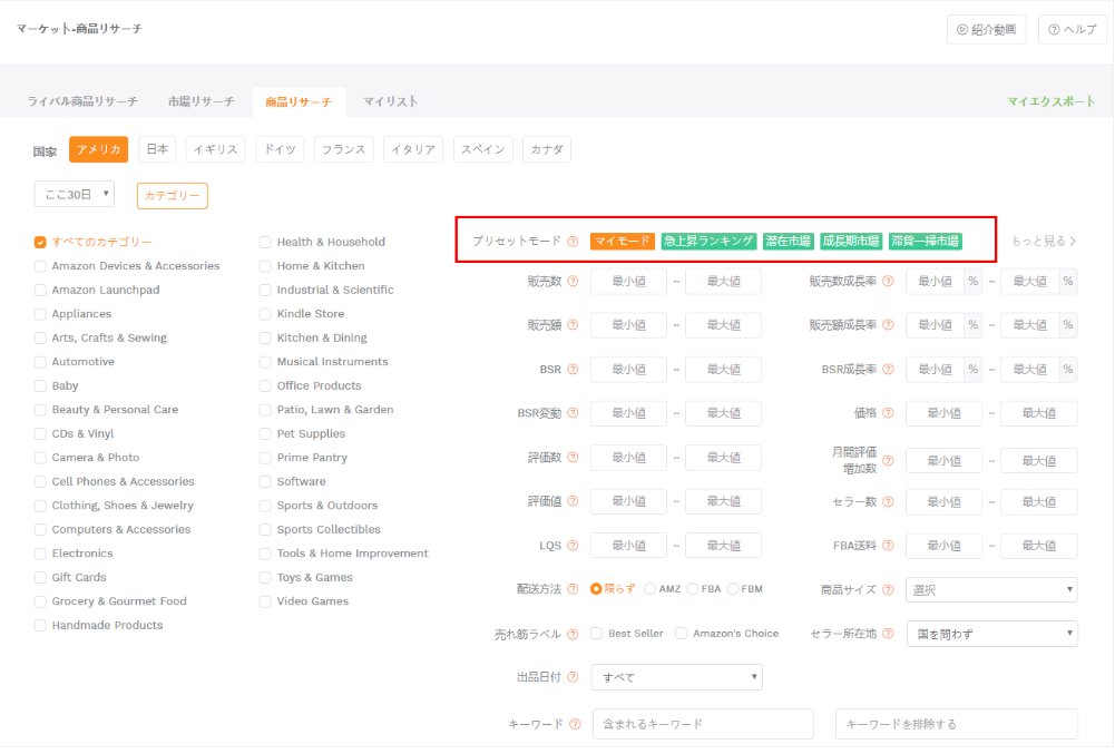 | 商品リサーチ | 参入したい市場規模や成長率に応じて該当する商品を知りたいときに便利な機能 |