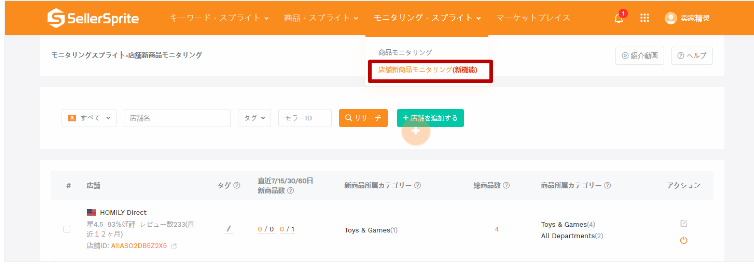 | 店舗新商品モニタリング | 基準となるライバルのセラーを登録しておくことで、セラーが新商品を出品するとその商品の動向を知れる機能 |