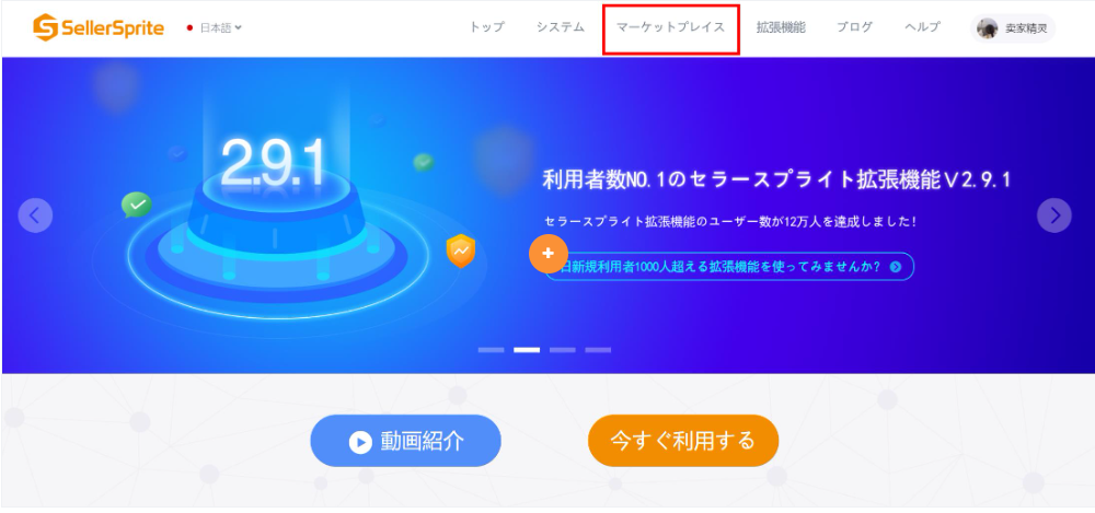 ①セラースプライトの画面上側「マーケットプレイス」をクリック