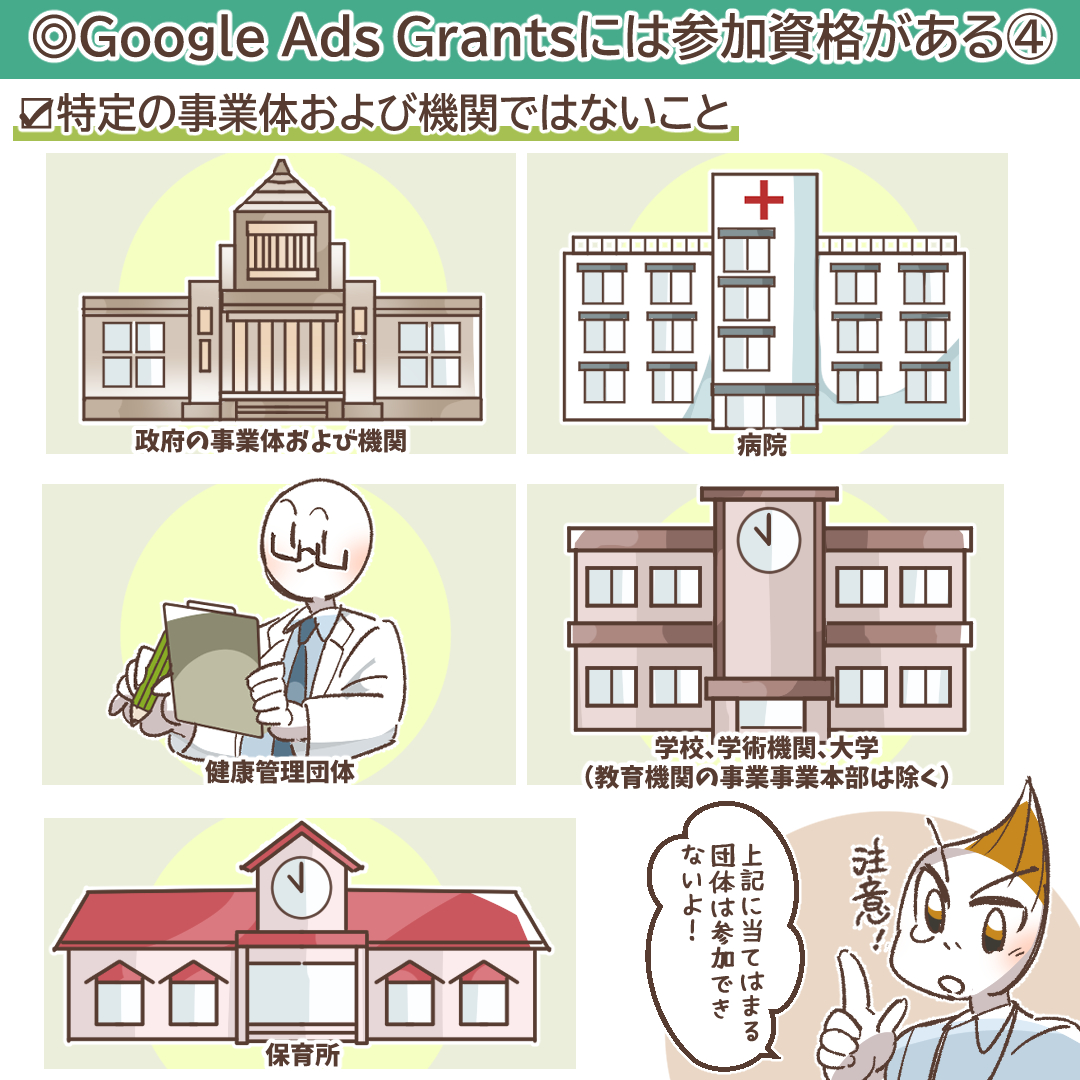 上記の事業体および機関に当てはまる団体は、Google for Noprofitsに参加できませんので、ご注意ください。