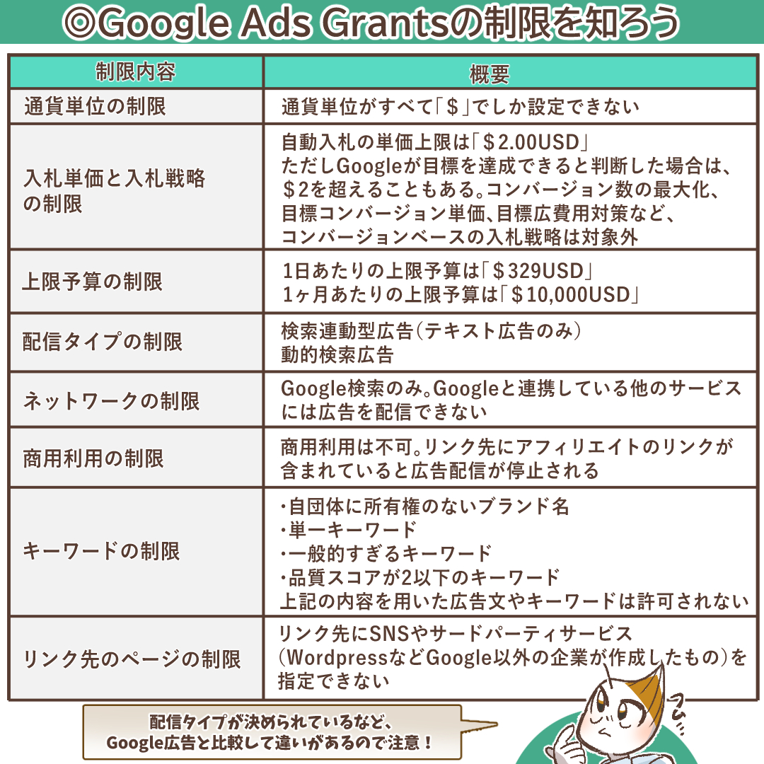 Google Ads Grants(グーグルアドグランツ)は、Google広告と同じプラットフォームを活用できますが、以下のような制限があります。