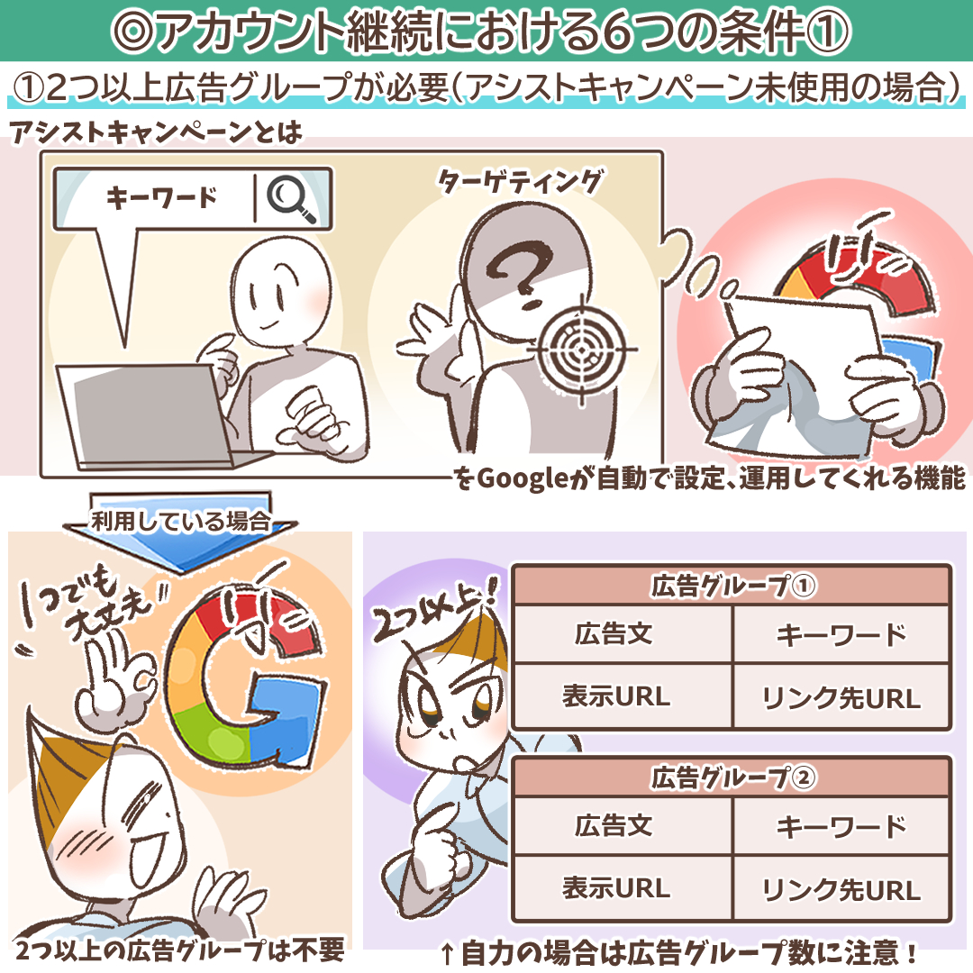 | 2つ以上の広告グループが必要 | アカウント毎に2つ以上の広告グループ作成が必要 |